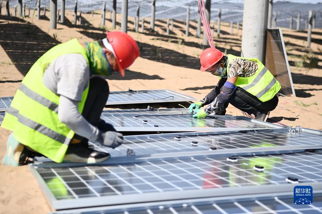 9月29日,在位于甘肅省武威市涼州區的甘肅武威50萬(wàn)千瓦立體光伏治沙產(chǎn)業(yè)化示范項目建設現場(chǎng),施工人員在安裝光伏板掛件。