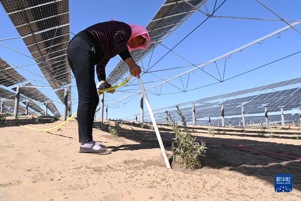 9月29日,在位于甘肅省武威市涼州區的甘肅武威50萬(wàn)千瓦立體光伏治沙產(chǎn)業(yè)化示范項目建設現場(chǎng),工人給光伏板下沙生植物澆水。