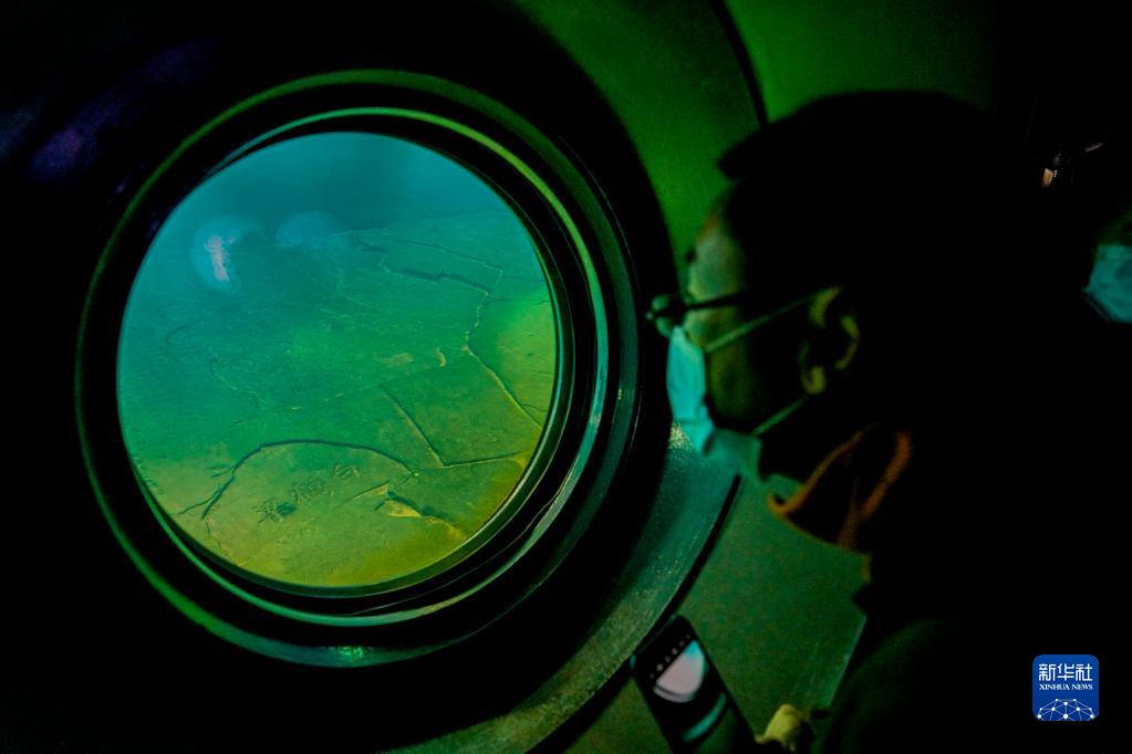 游客在重慶白鶴梁水下博物館的水下參觀(guān)廊道內,通過(guò)觀(guān)景窗觀(guān)看保護罩內的白鶴梁題刻(2021年2月21日攝)。