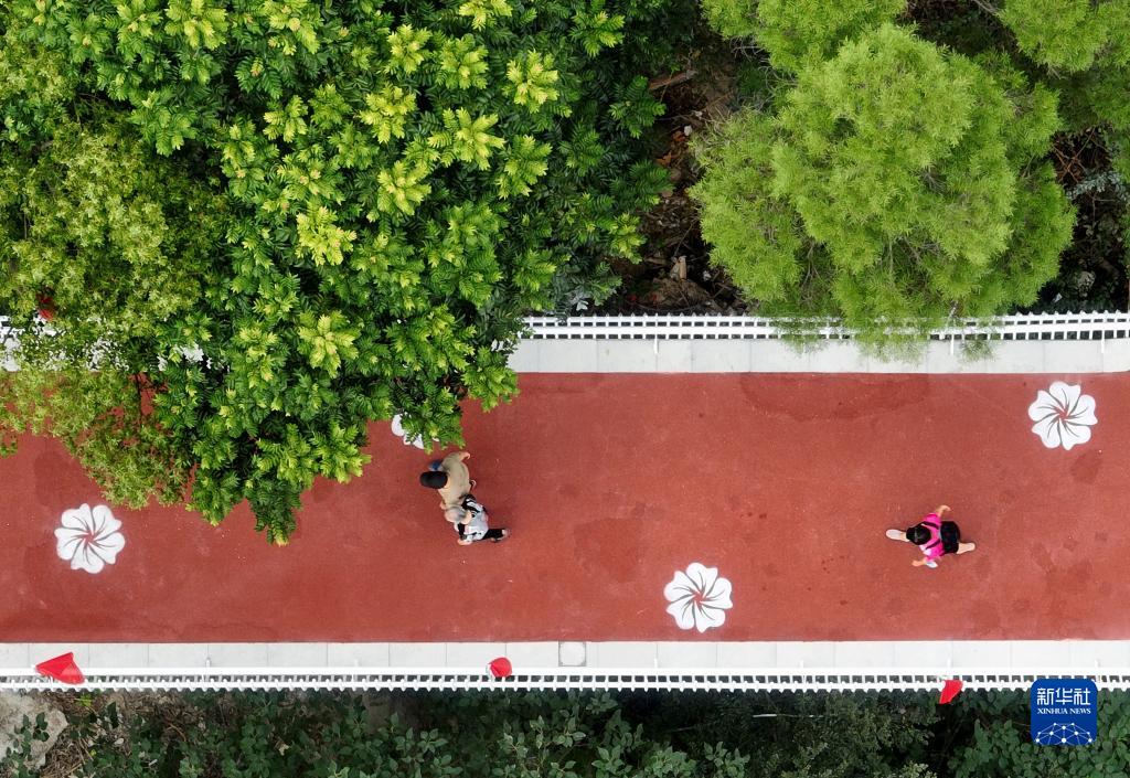 10月1日,在福建省福州市,市民在新開(kāi)放的金雞山公園茉莉花生態(tài)廊道游玩(無(wú)人機照片)。