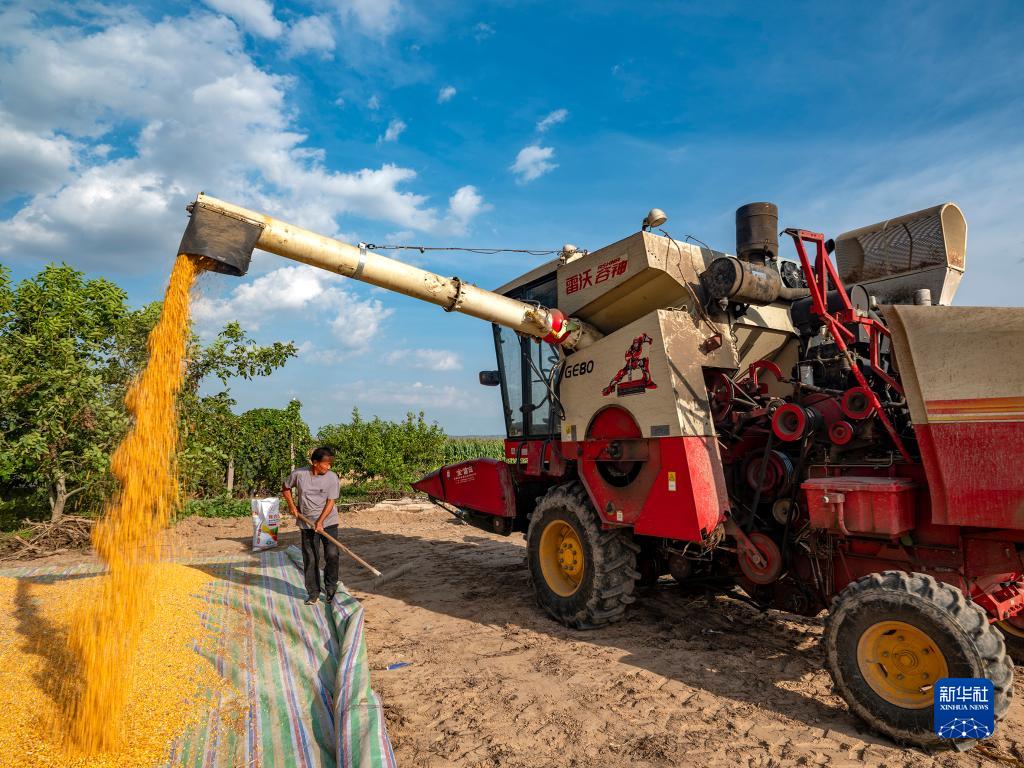 9月22日,在河南省三門(mén)峽市靈寶市西閻鄉萬(wàn)畝黃河灘地,一家農業(yè)機械服務(wù)合作社的工作人員駕駛農機為農戶(hù)卸放收獲的玉米。