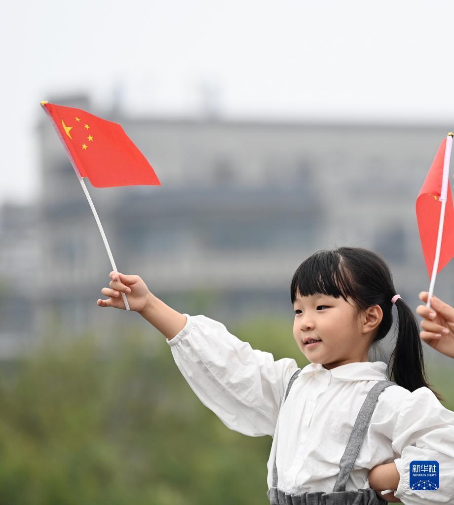 10月1日,在陜西省西安市,小游客在西安城墻景區揮舞國旗。