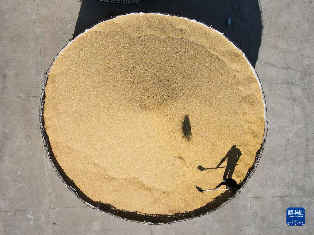 9月28日,在呼倫貝爾農墾綽爾河農牧場(chǎng),工作人員在平整大豆(無(wú)人機照片)。