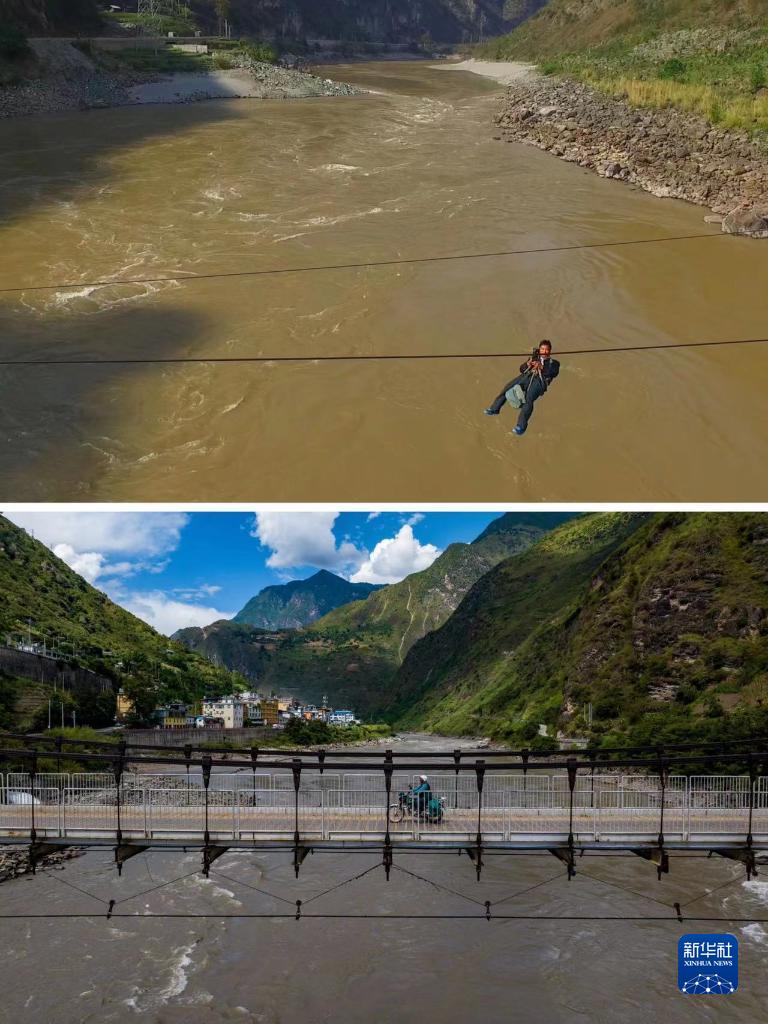 這是一張拼版照片:上圖為怒江州瀘水市稱(chēng)桿鄉郵政所所長(cháng)桑南才溜索過(guò)江送信(資料照片)。下圖為2022年9月13日,桑南才乘摩托車(chē)過(guò)江送信(新華社記者江文耀攝,無(wú)人機照片)。2021年,他被授予“全國優(yōu)秀共產(chǎn)黨員”稱(chēng)號。