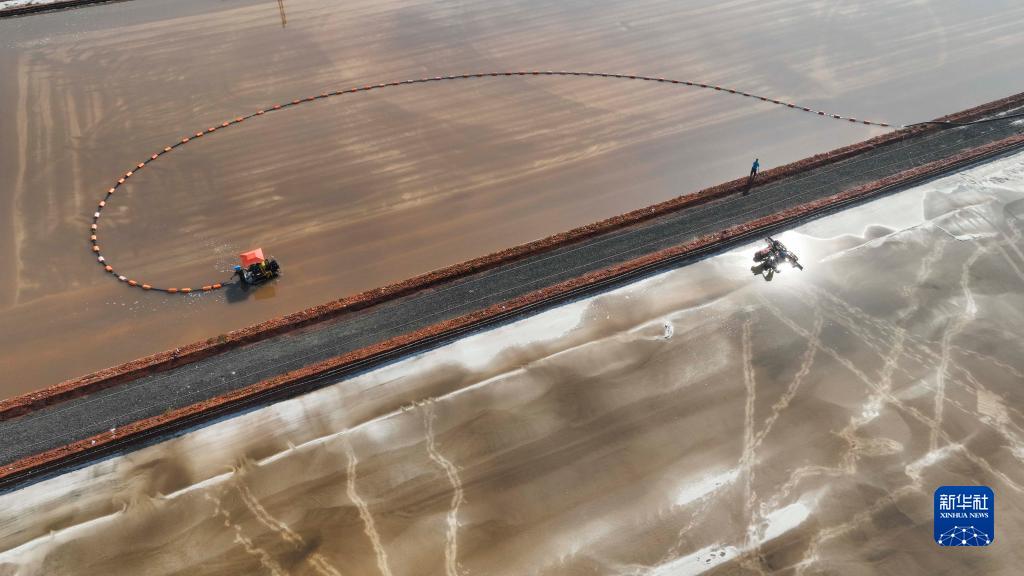 9月27日,工人在唐山海港經(jīng)濟開(kāi)發(fā)區長(cháng)蘆大清河鹽場(chǎng)收獲秋鹽(無(wú)人機照片)。