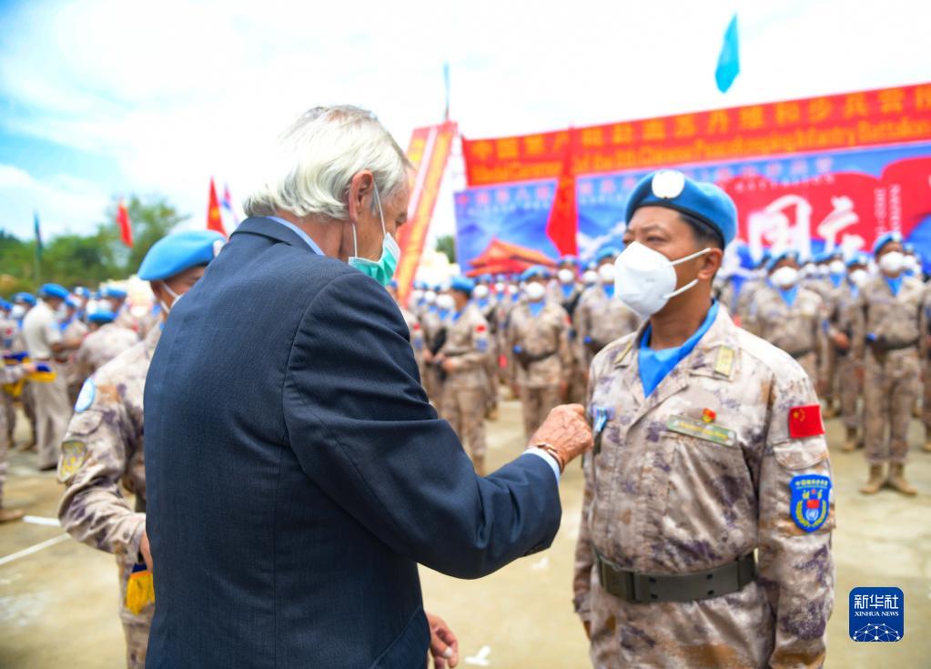 9月30日,在聯(lián)合國駐南蘇丹特派團超級營(yíng)地,聯(lián)合國秘書(shū)長(cháng)特別代表兼聯(lián)南蘇團團長(cháng)尼古拉斯·海瑟姆為中國維和官兵授勛。
