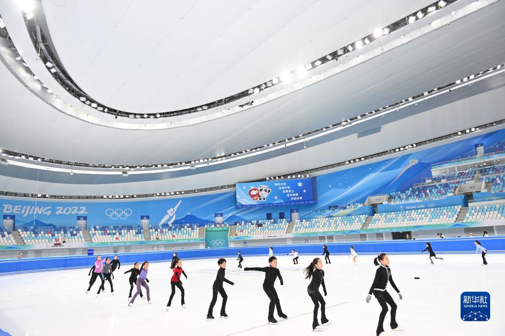10月1日,青少年在“冰絲帶”內參加花樣滑冰培訓。