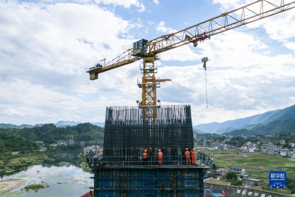 10月2日,在湖南桑龍高速賀龍特大橋建設現場(chǎng),中鐵五局工人在橋梁主塔上進(jìn)行鋼筋綁扎作業(yè)(無(wú)人機照片)。