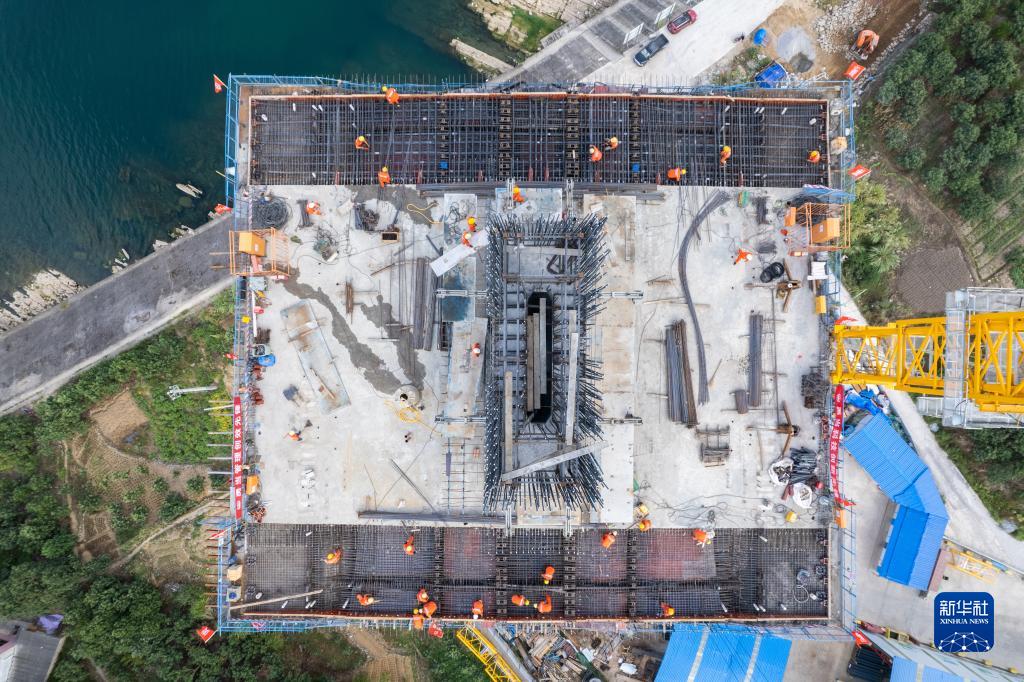 10月2日,在湖南桑龍高速賀龍特大橋建設現場(chǎng),中鐵五局工人在施工作業(yè)(無(wú)人機照片)。