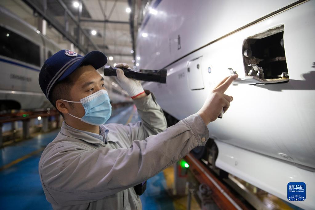 10月1日晚,在中國鐵路哈爾濱局集團有限公司哈爾濱動(dòng)車(chē)段檢修車(chē)間內,動(dòng)車(chē)組地勤機械師韓洪瑞在進(jìn)行檢修作業(yè)。