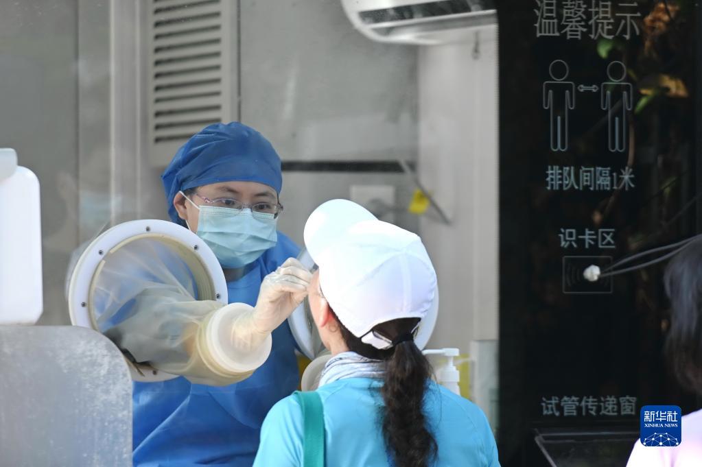10月2日,核酸采樣員在福州市鼓樓區一處采樣點(diǎn)為市民服務(wù)。