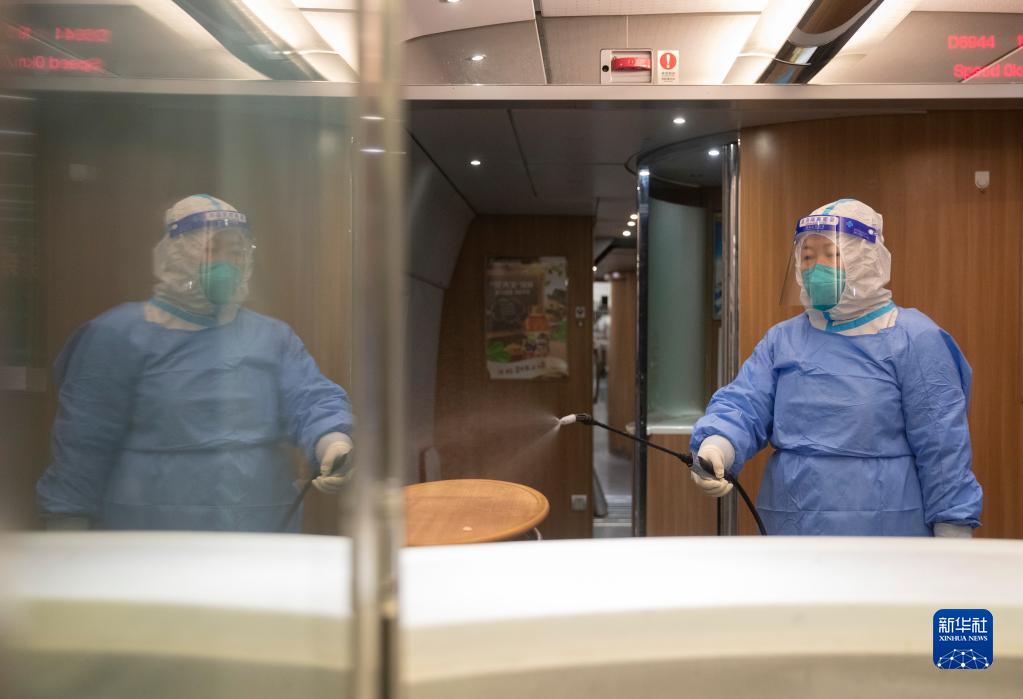10月1日,在中國鐵路哈爾濱局集團有限公司哈爾濱動(dòng)車(chē)段檢修車(chē)間內,哈爾濱鐵路疾病預防控制中心的張強給動(dòng)車(chē)組車(chē)廂消殺。