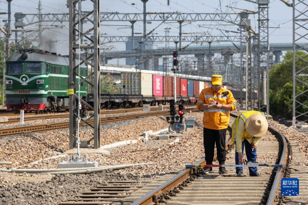 10月2日,在上海市松江區新橋鎮申北四路下穿立交施工現場(chǎng),中國鐵路上海局集團有限公司上海工務(wù)段施工監督員陳得志(左)記錄檢查數據。