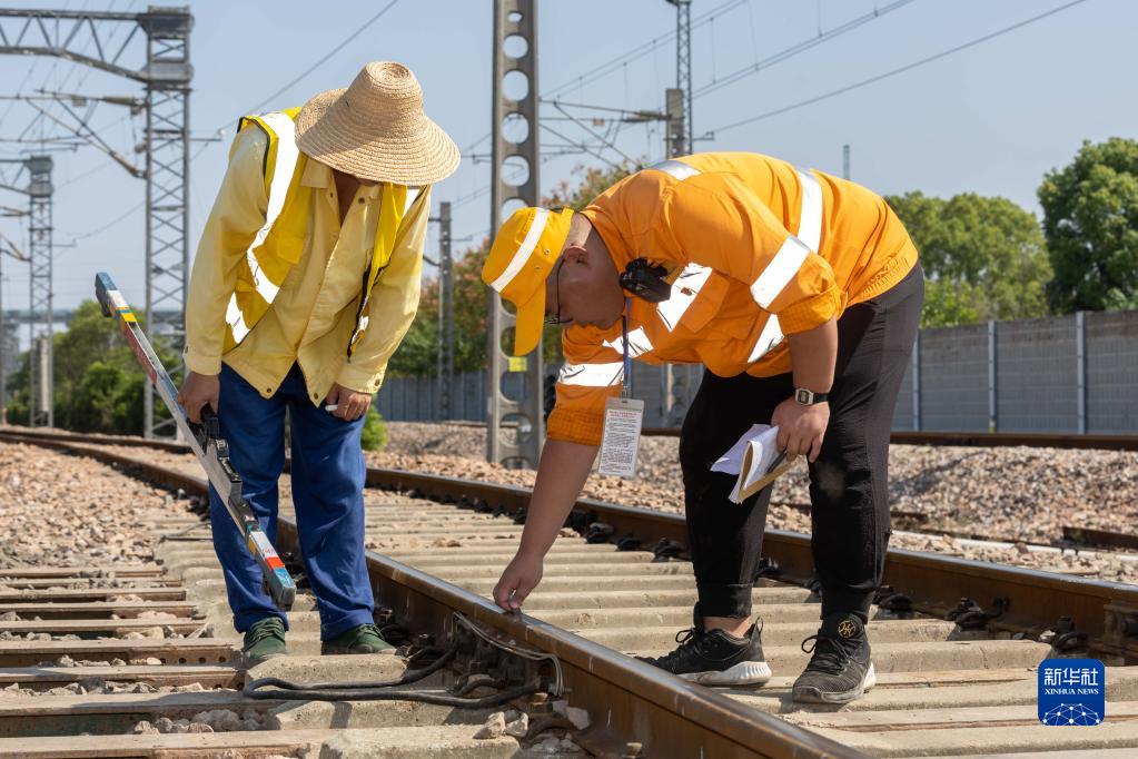 10月2日,在上海市松江區新橋鎮申北四路下穿立交施工現場(chǎng),中國鐵路上海局集團有限公司上海工務(wù)段施工監督員陳得志(右)測量鋼軌軌縫。