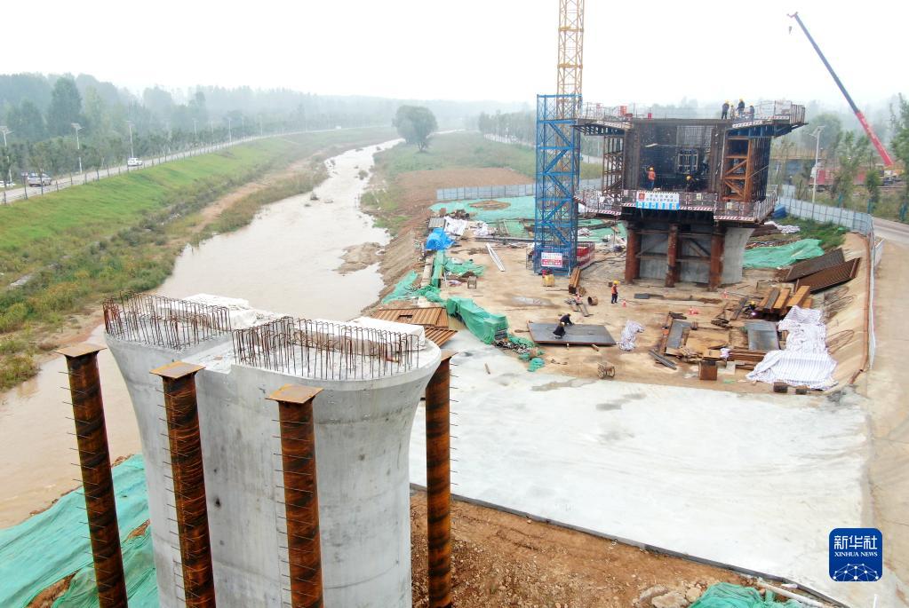 10月2日,中鐵上海工程局施工人員在位于陜西省西安市的西十高鐵跨浐河連續梁0號塊作業(yè)(無(wú)人機照片)。