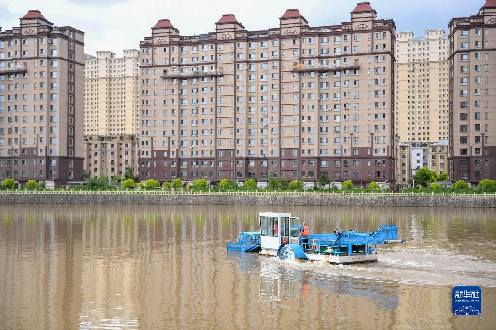 在吉林省遼源市東遼河,工作人員駕駛垃圾清理船清理水中垃圾(2022年7月5日攝)。