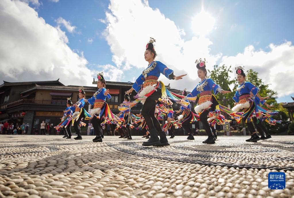 10月2日,游客在貴州省丹寨縣萬(wàn)達小鎮景區觀(guān)看舞蹈表演。