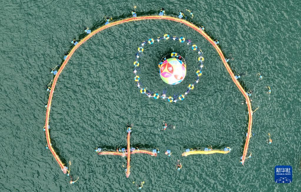 10月2日,游泳愛(ài)好者在廣西柳州柳江江面上擺出“十一”造型(無(wú)人機照片)。