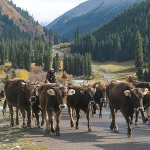 進(jìn)入10月,新疆伊犁哈薩克自治州昭蘇縣夏特柯?tīng)柨俗巫遴l闊斯托別村牧民趕著(zhù)褐牛走出夏塔大峽谷。連日來(lái),隨著(zhù)氣溫降低,昭蘇縣各族牧民紛紛將山區峽谷里的褐牛趕往平原田野放養。