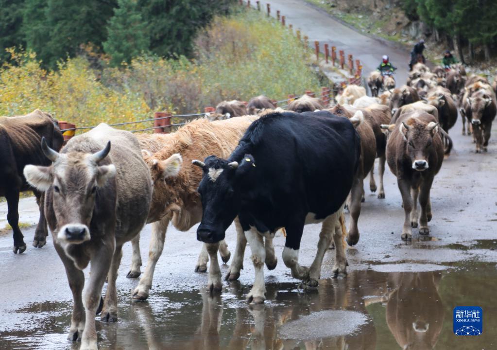 牧民趕褐牛走出山谷,轉場(chǎng)到平原草場(chǎng)(10月1日攝)。