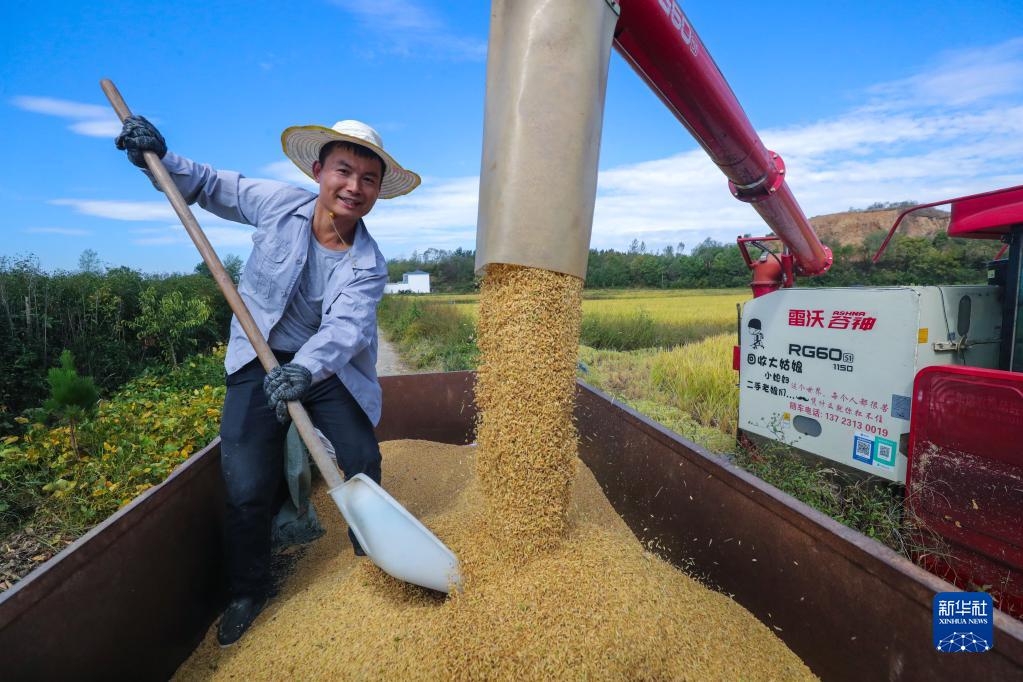 10月2日,河南省信陽(yáng)市光山縣南向店鄉何畈村鑫磊合作社社員在搶收水稻。