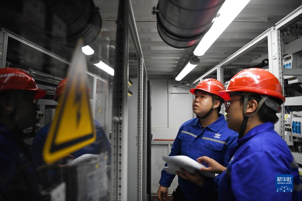 10月3日,在蕪湖城南過(guò)江隧道施工現場(chǎng),工作人員杜世?。ㄗ螅┖屯略谶M(jìn)行設備巡檢。