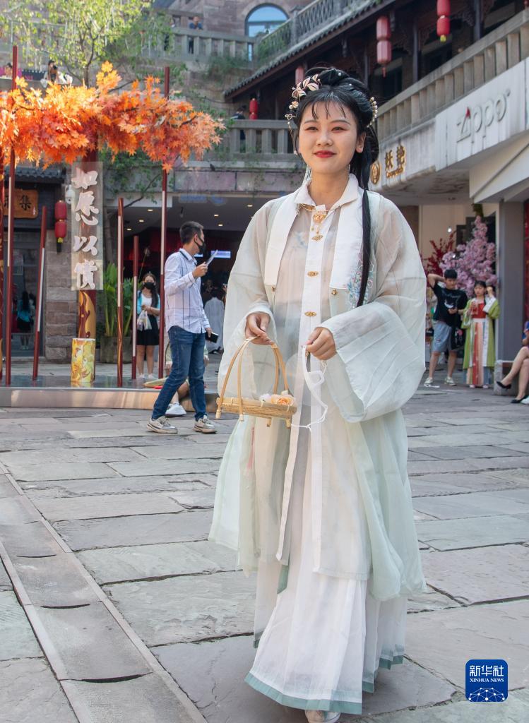 10月2日,在千年古鎮磁器口后街,漢服愛(ài)好者在景區內游玩。