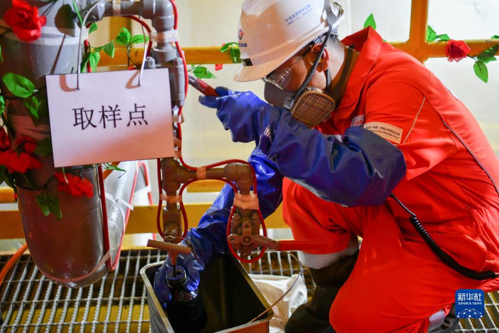 中海油工作人員在“?;惶枴比狱c(diǎn)接取原油(9月30日攝)。