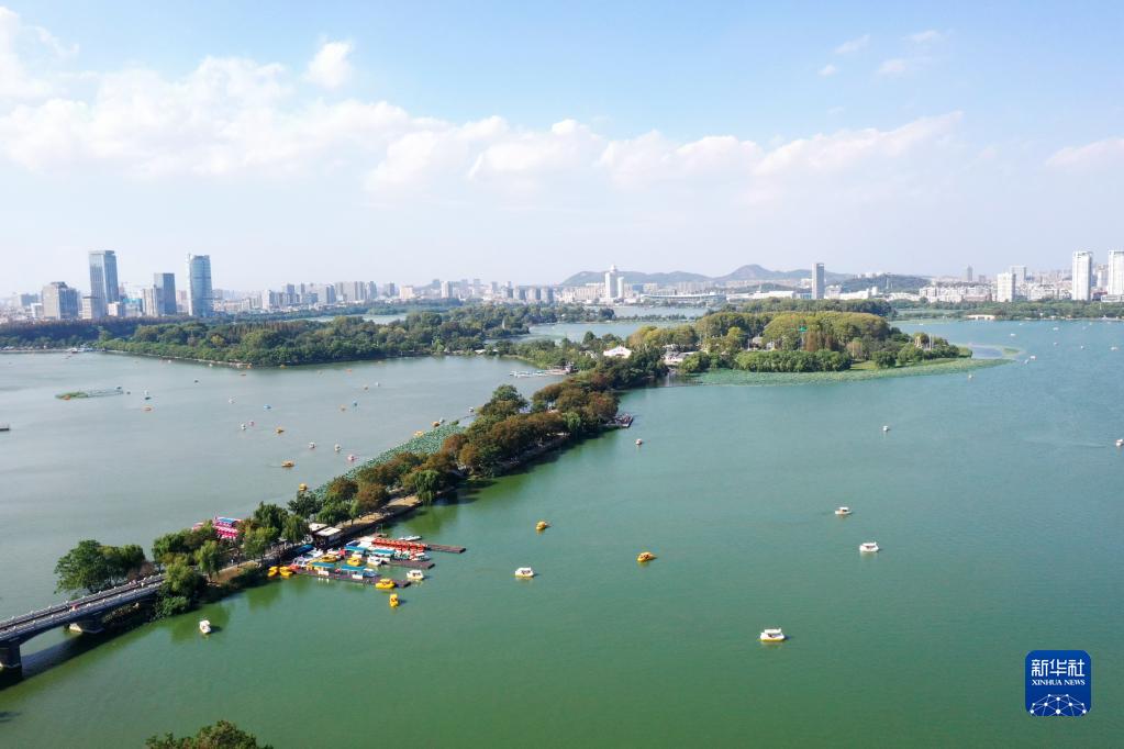 10月3日,游客在南京玄武湖公園劃船游玩(無(wú)人機照片)。