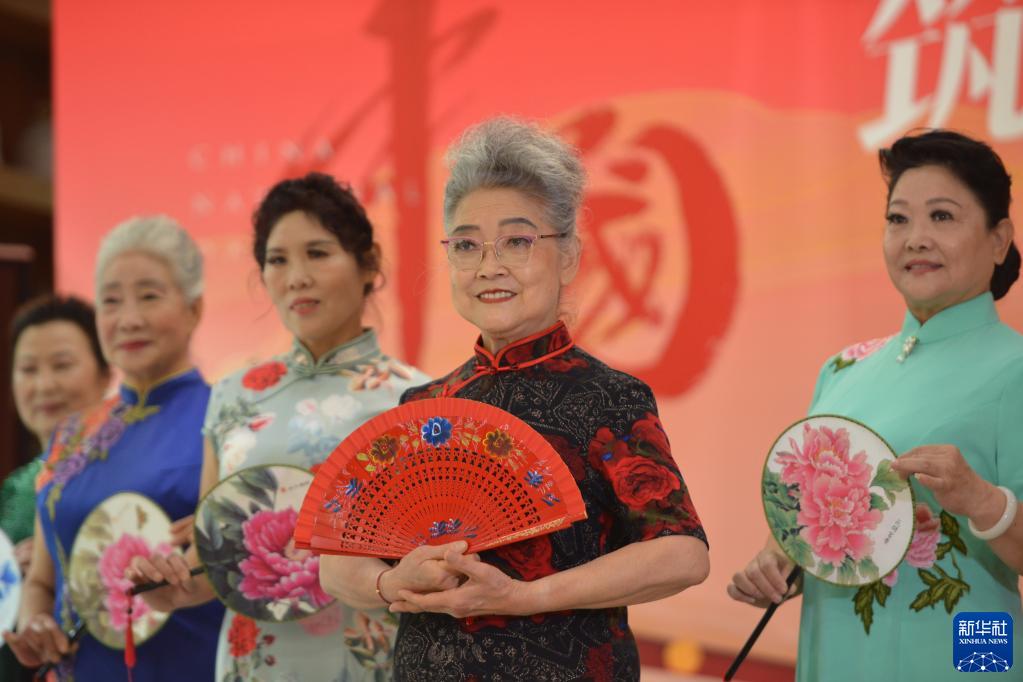 10月3日,75歲的韓香巧(右二)在河北省石家莊市新華區一家養老機構進(jìn)行模特表演。韓香巧從70歲開(kāi)始學(xué)習模特表演,如今她成為了當地年齡最高的模特隊員。