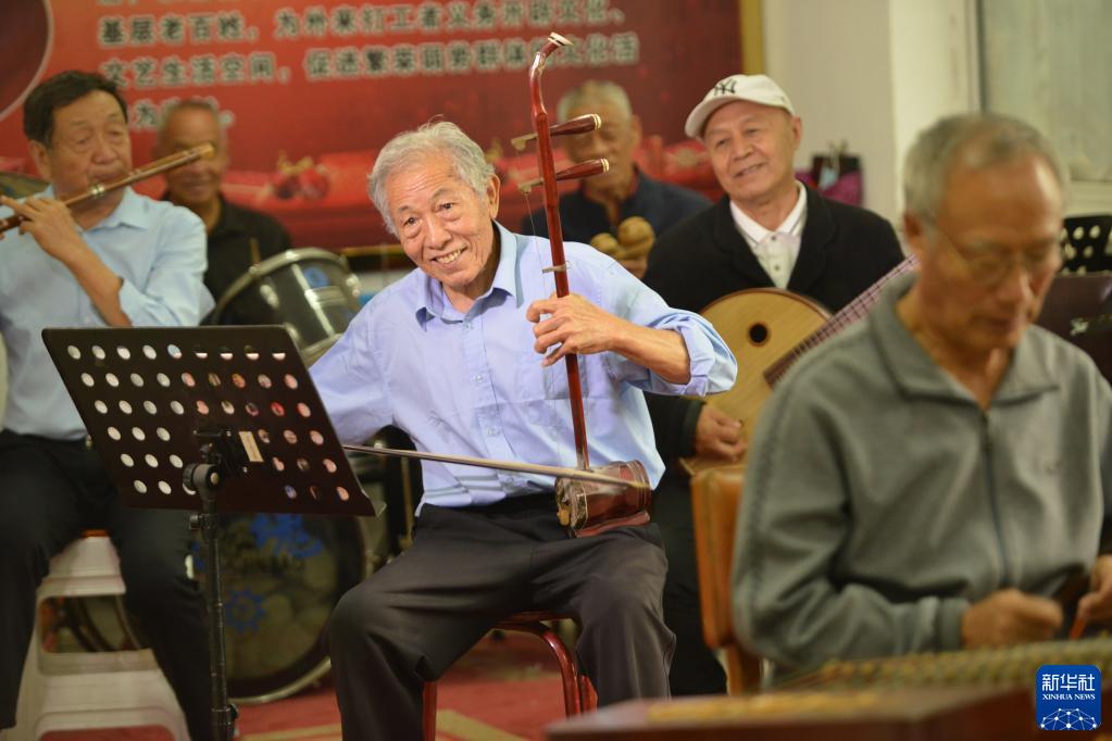 10月2日,80歲的劉名飛(中)在河北省石家莊市欒城區農民工俱樂(lè )部排練。劉名飛參加農民工俱樂(lè )部已有11年,義務(wù)為鄉親們表演。