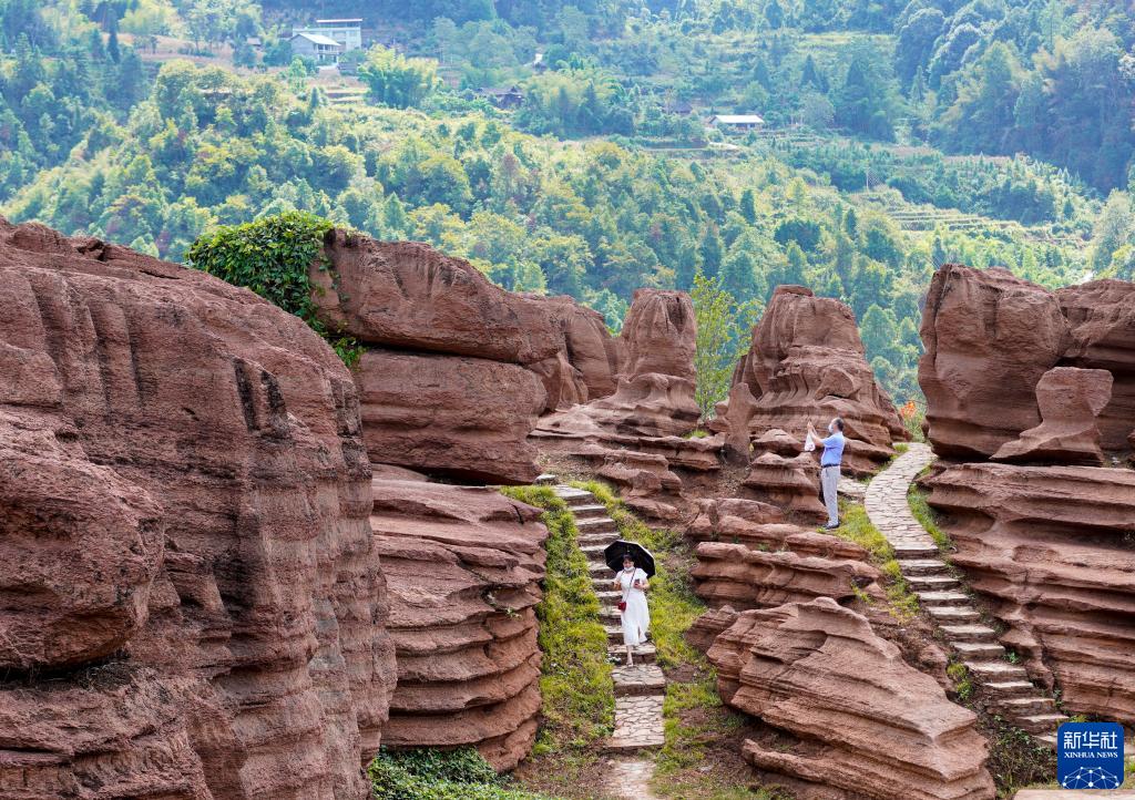 國慶期間,重慶市酉陽(yáng)縣紅石林地質(zhì)公園開(kāi)園迎客,不少游客前來(lái)感受這里獨特的地質(zhì)奇觀(guān)。