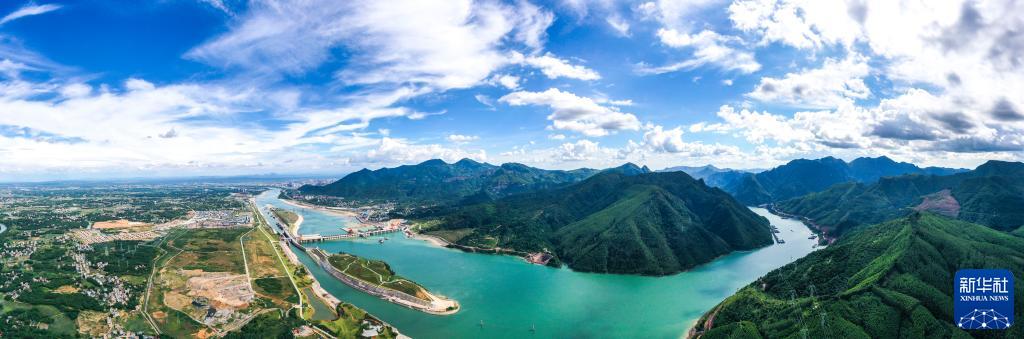 這是建設中的廣西大藤峽水利樞紐工程和周邊峽谷(2022年8月9日攝,無(wú)人機照片)。