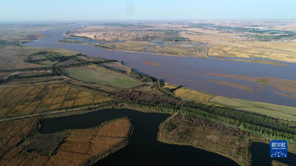 這是10月4日在寧夏銀川市賀蘭縣拍攝的黃河秋景(無(wú)人機照片)。