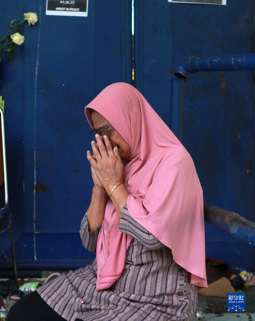 10月4日,一名婦女在印度尼西亞?wèn)|爪哇省瑪瑯市事發(fā)球場(chǎng)的入口前哭泣,悼念踩踏事件遇難者。