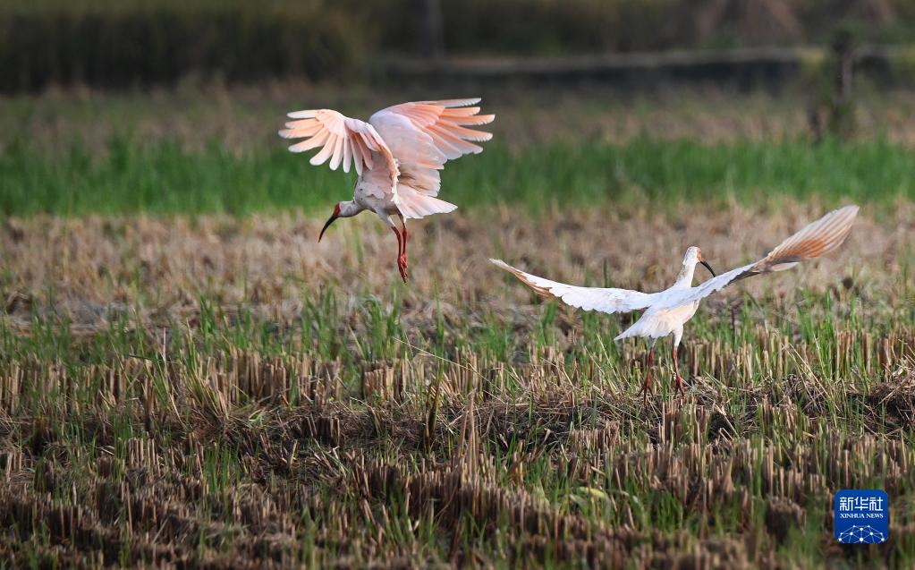 兩只朱鹮在陜西省洋縣謝村鎮一片收割后的稻田里嬉戲(2022年9月22日攝)。新華社記者 陶明 攝