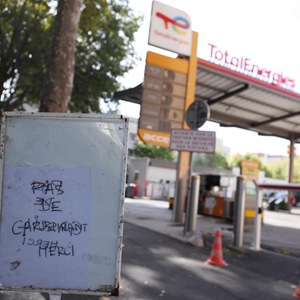 10月4日,在法國巴黎附近的克里希市,一處道達爾加油站前擺出“沒(méi)有油了,謝謝”的公告牌。
