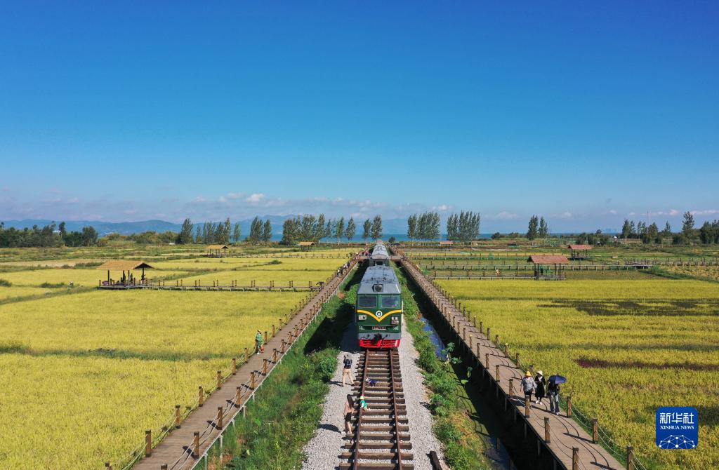 10月5日,游客在昆明市晉寧區晉城街道沙堤村游覽拍照(無(wú)人機照片)。