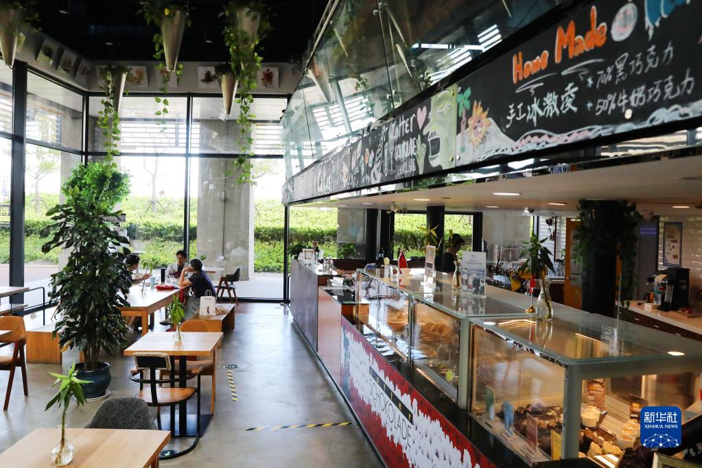 游客們在位于上海楊浦濱江的奧地利珍得巧克力劇院內品嘗巧克力食品(2022年9月24日攝)。