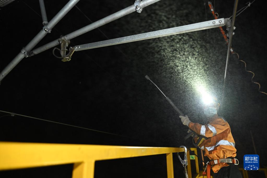 10月5日凌晨,在安徽宣城杭黃高鐵績(jì)溪段,接觸網(wǎng)工在沖洗接觸網(wǎng)絕緣子。