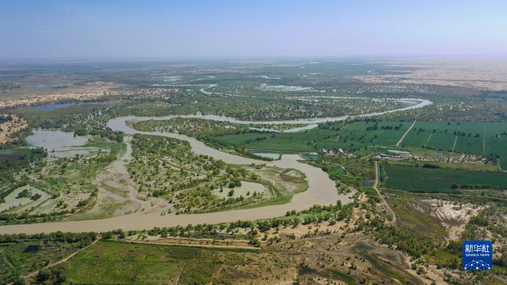 這是2022年8月18日在新疆尉犁縣墩闊坦鄉拍攝的塔里木河兩岸的植被和農田(無(wú)人機照片)。