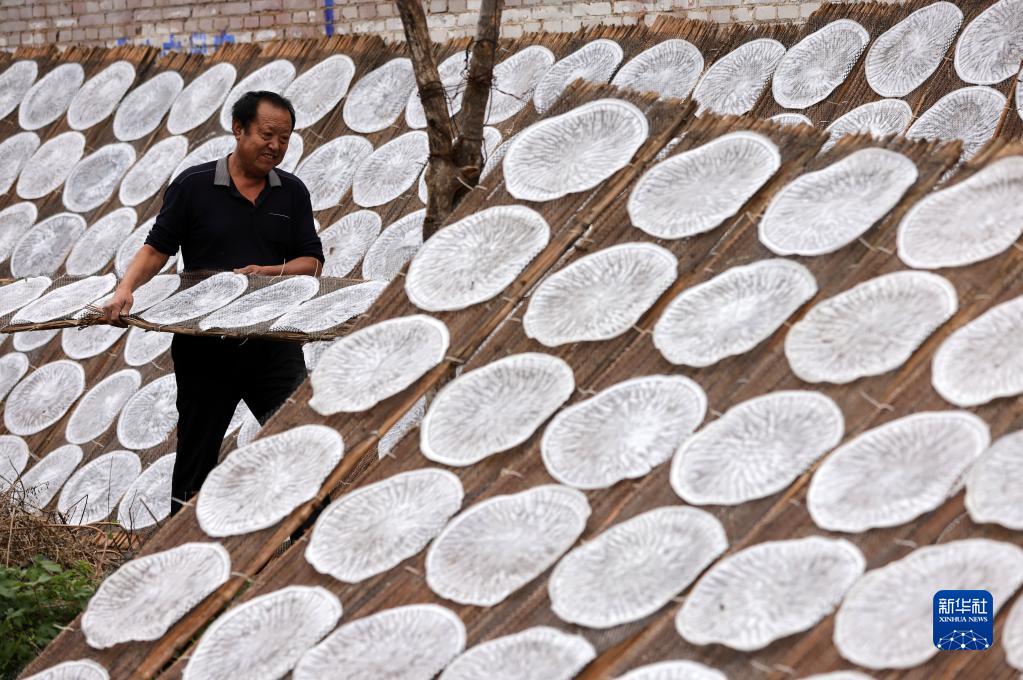 10月5日,河北省邢臺市廣宗縣大平臺鄉劉南蘇村村民在房屋前晾曬粉皮。