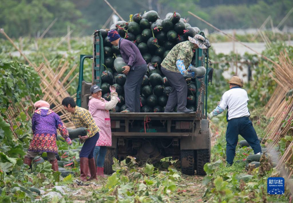 海南省瓊海市潭門(mén)鎮福田村的農民在裝運收獲的冬瓜(2022年2月24日攝)。
