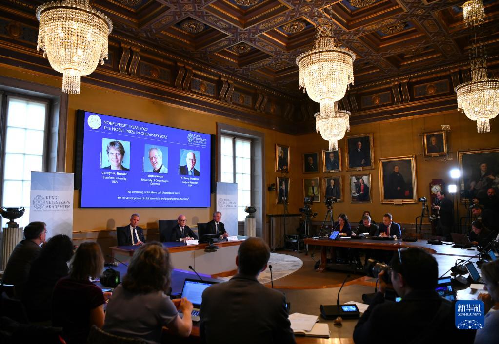 這是10月5日在瑞典斯德哥爾摩拍攝的2022年諾貝爾化學(xué)獎公布現場(chǎng)。
