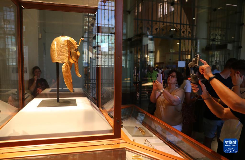 10月5日,在位于埃及開(kāi)羅的埃及博物館,游客拍攝法老蘇瑟奈斯一世的金面具。 新華社記者 隋先凱 攝