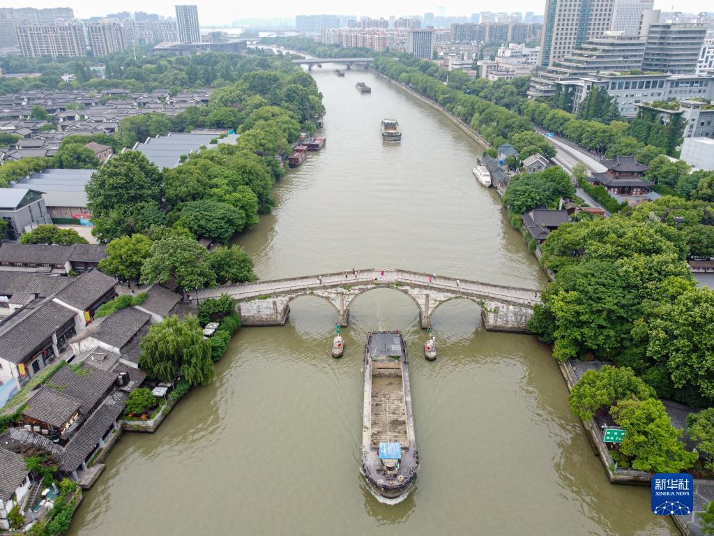 行駛在大運河上的貨船通過(guò)杭州拱宸橋(2022年5月27日攝,無(wú)人機照片)。