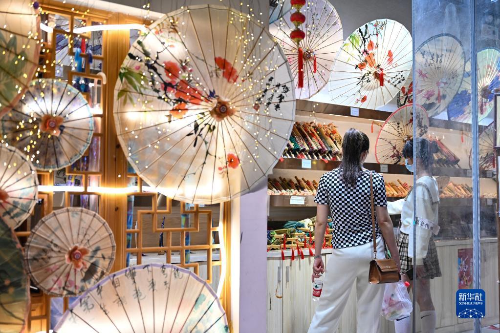 10月6日,游客在福州三坊七巷歷史文化街區挑選油紙傘。
