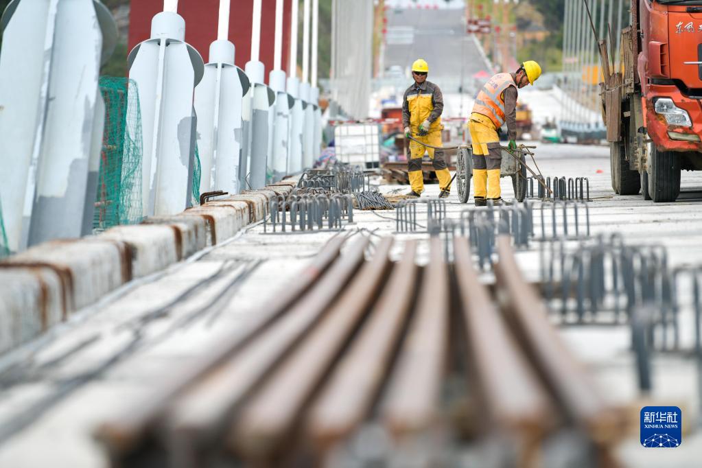 10月6日,中交二公局的工人在貴州龍里河大橋上對附屬工程施工。