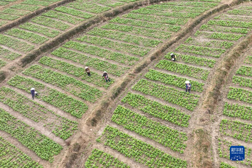 10月6日,村民在貴州省黔東南苗族侗族自治州岑鞏縣水尾鎮大樹(shù)林村蔬菜基地勞作(無(wú)人機照片)。