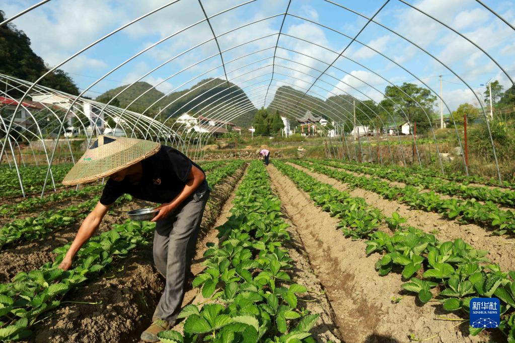 10月6日,貴州省黔南布依族苗族自治州平塘縣牙舟鎮卡羅村的村民在管護草莓苗。